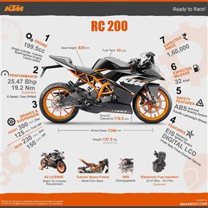 2014 KTM RC 200 has a 199.5cc, single-cylinder, 4-stroke, Liquid-cooled, spark-ignition engine with a maximum power of 25.47 bhp and a maximum torque of 19 Nm and is mated with a 6-speed claw-shifted transmission. It has a bore and stroke of 72mm and 49mm respectively, engine lubrication is done by forced oil lubrication with one rotor pump, mechanically operated clutch in oil bath and a contactless, controlled and fully electronic ignition system with digital ignition timing adjustment. The steering head angle is 66.5-degrees now.